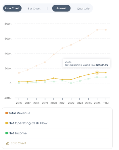 Financially, Amazon generated $139.5 billion in operating cash flow in 2025, giving it the ability to fund a significant portion of its planned $200 billion in capital expenditures without relying heavily on external financing. Strong operating cash flow means Amazon’s core businesses are producing cash consistently, not just accounting profits. Combined with its substantial cash reserves, this reduces the need to issue new debt or dilute shareholders, even during an aggressive investment cycle.
