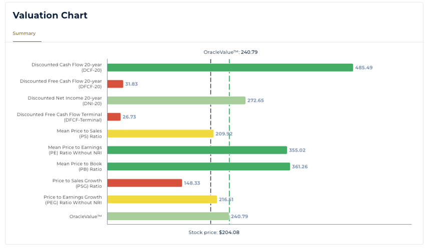 Amazon’s valuation chart places OracleValue™ in the mid-$240s, comfortably above the current stock price near $204, implying that the market is discounting a period of near-term pressure.