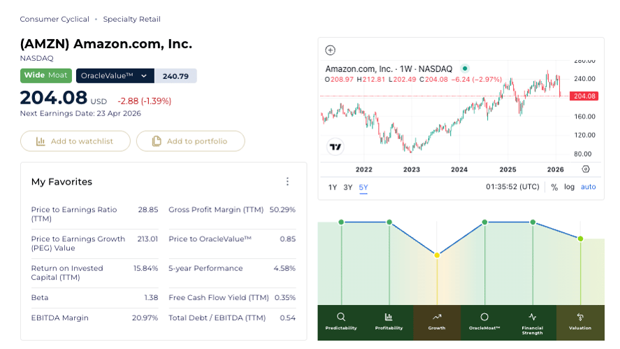 AMZN is currently trading at a Price/OracleValue™ estimate of 0.85 on 12th February 2026, indicating the stock’s OracleValue™ is estimated to be priced attractively.