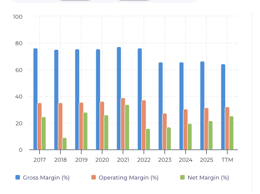 Oracle's Gross Margin has remained above 60% with an obvious dip in 2023 from high 70% to the lows 60%. These are ok numbers for a technology company and reflect the high-margin nature of its software and cloud licensing business.
