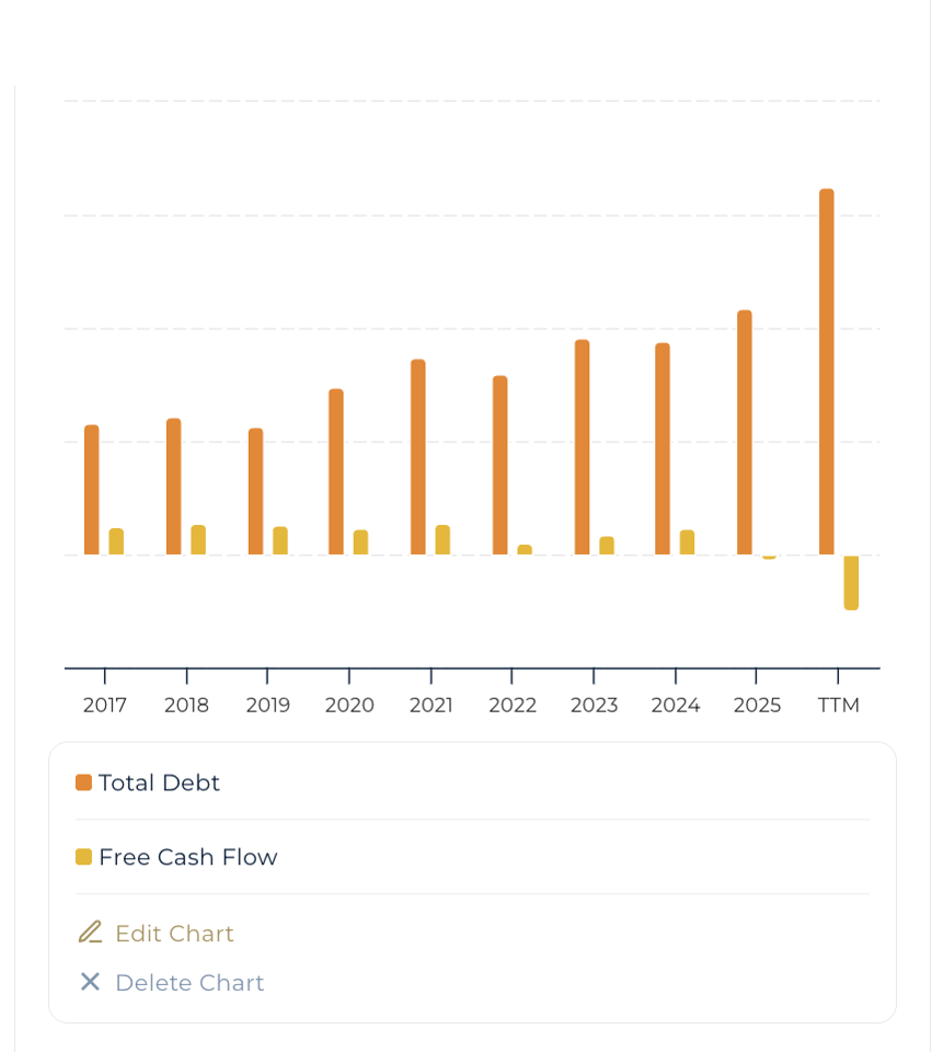 This is where the financial picture becomes more complicated. Oracle's Total Debt has climbed to record levels, and for the first time in its recent history, Free Cash Flow has turned negative on a trailing twelve-month basis. Net Operating Cash Flow remains positive, but the gap between operating cash generation and capital expenditure is widening.
