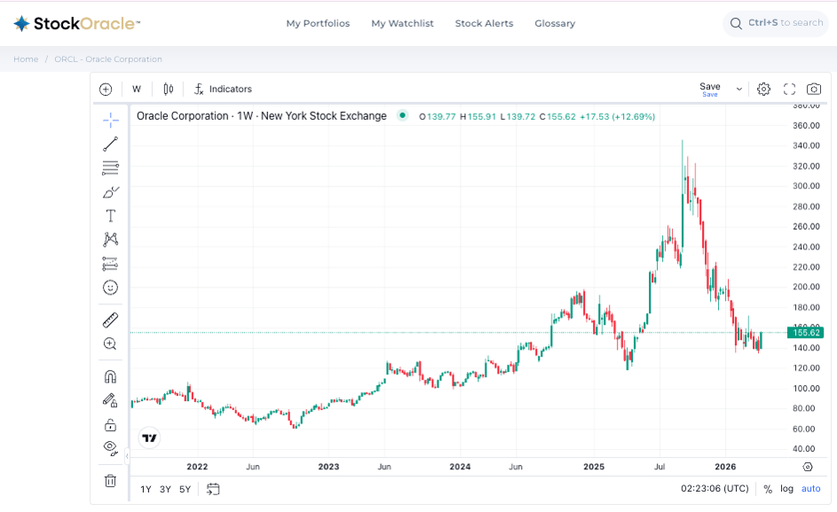 Oracle Corporation (ORCL) was one of the defining AI stocks of 2025 capturing headlines and attention. From May 2024, the stock more than doubled, riding a wave of cloud infrastructure euphoria and a landmark partnership with OpenAI to reach an all-time high near $345 in September 2025. Then it reversed, sharply. By April 2026, Oracle was trading near $155, representing a drawdown of around 55% from the peak.