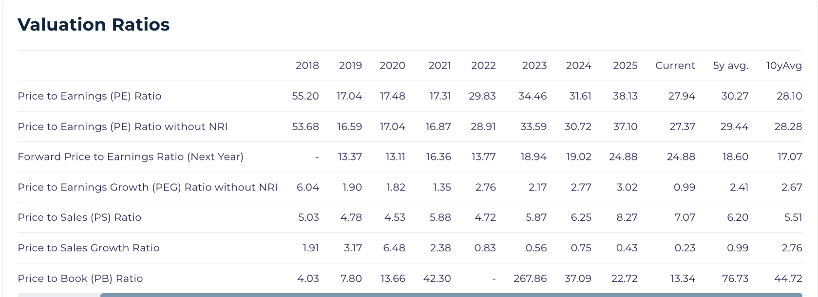 Oracle's current trailing PE of 27.94 is broadly in line with both its 5-year average of 30.27 and its 10-year average of 28.10, suggesting the stock is priced reasonably on a historical earnings basis. The PEG ratio is estimated at 0.99 implies the market is pricing Oracle's growth at roughly one times its earnings growth rate.