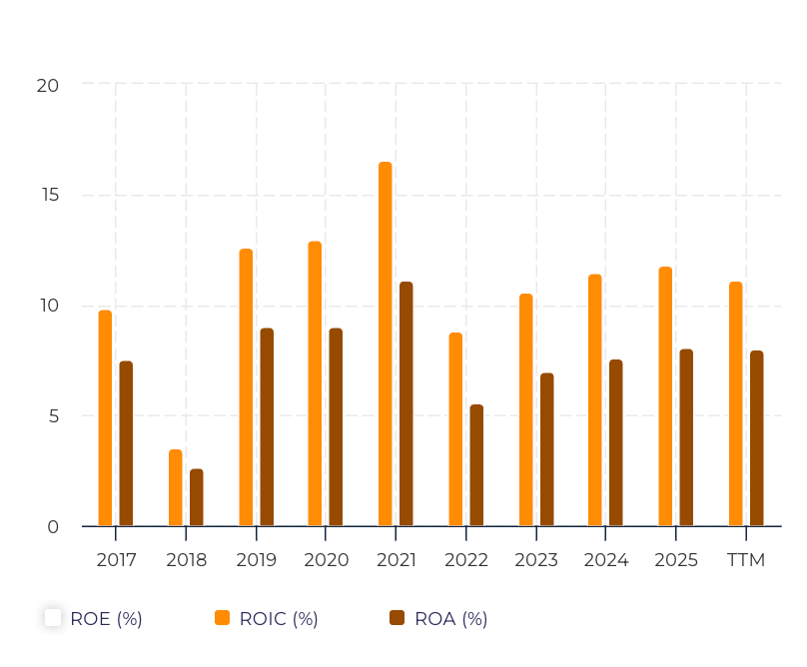 Return on Equity (ROE) appears elevated at roughly 57%, though this figure is significantly amplified by Oracle's negative book equity, a result of aggressive buybacks and debt-financed capital spending. ROIC of approximately 11% is a more grounded measure of capital efficiency.
