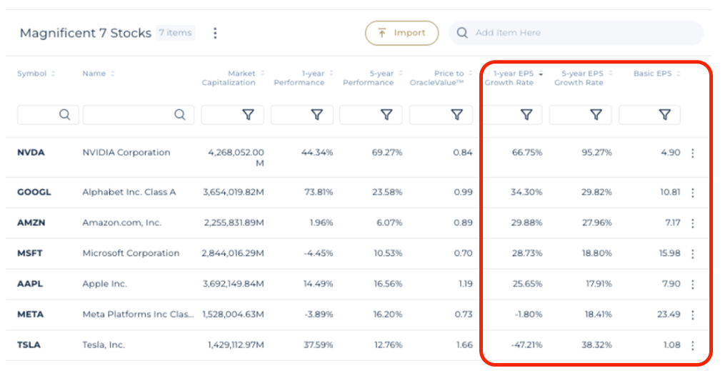 Earnings per share growth is a signal of business momentum. Across the Magnificent 7, the spread in EPS growth rates tells a story of diverging trajectories: