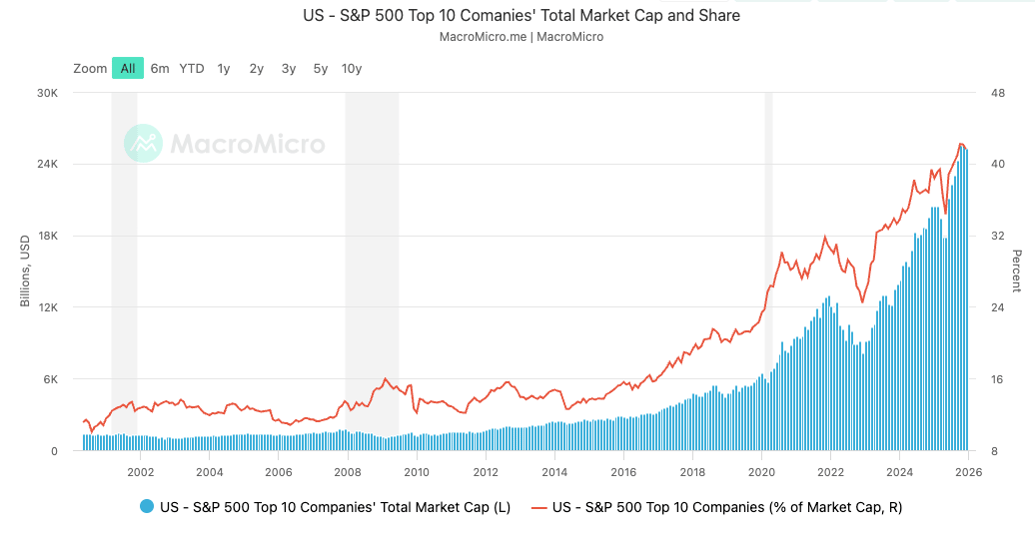 Source : S&P500 https://en.macromicro.me/collections/34/us-stock-relative/123442/us-sp-500-top-10-companies-total-market-cap-and-share