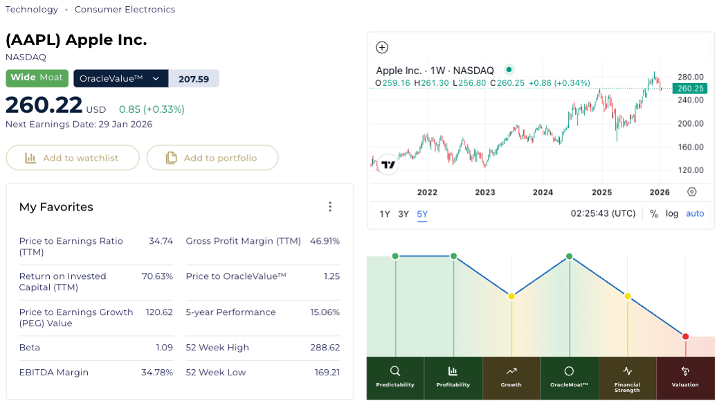 Through StockOracle™ breakdown of Apple, the company displays high Predictability, Profitability, and OracleMoat™, driven by consistent cash flows, strong margins, and deep customer lock-in. Growth remains moderate as core product lines mature, while Financial Strength sits in the mid-range due to capital returns and balance-sheet optimization. Valuation stands out as the weakest signal, with Price-to-OracleValue™ indicating the stock is trading well above OracleValue™, making pricing the primary constraint within an otherwise decent-quality OracleIQ™ profile.
