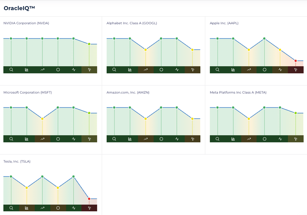Viewed through OracleIQ™, the Magnificent 7 shares strong foundations, with Predictability, Profitability, OracleMoat™, and Financial Strength largely in the green across the group.