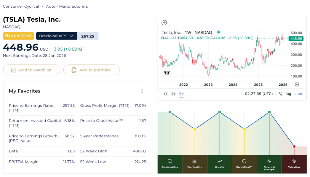 Through Tesla’s full StockOracle™ breakdown, the company shows high Predictability and Financial Strength, supported by scale and balance-sheet resilience, while Profitability and OracleMoat™ register at mid levels, reflecting competitive pressures. Growth remains high, driven by long-term adoption expectations, but Valuation stands out as extremely stretched, with Price-to-OracleValue™ indicating the stock is trading above OracleValue™, making valuation a constraint within Tesla’s OracleIQ™ profile.