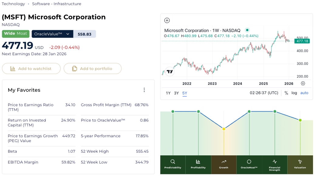 Through the StockOracle™ breakdown of Microsoft, the company shows high Predictability, Profitability, OracleMoat™, and Financial Strength, supported by recurring enterprise revenues, strong margins, and a robust balance sheet. Growth registers at a mid level, reflecting steady expansion rather than hypergrowth, while Valuation sits above mid-range, suggesting Microsoft is still trading at a relatively fair valuation.