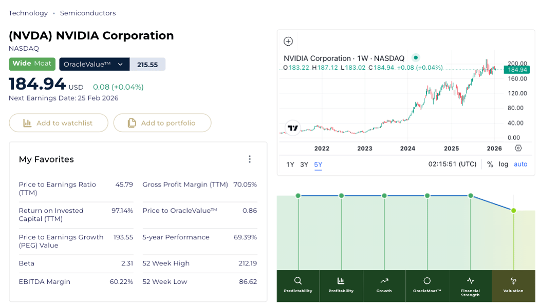 Through StockOracle™ Nvidia’s breakdown, Nvidia stands out for its exceptionally strong Predictability, Profitability, OracleMoat™, and Financial Strength, reflecting stable cash flows, dominant margins, and a competitive position that is difficult to challenge. Growth signals remain elevated, supported by sustained demand for AI and data-center computing, reinforcing Nvidia’s long-term expansion profile.