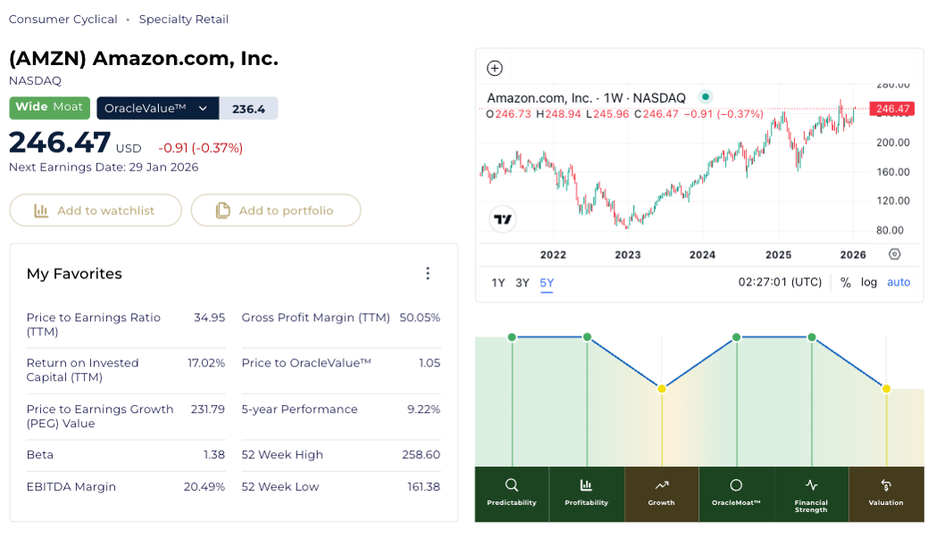 Through Amazon’s StockOracle™ breakdown, the company shows high Predictability, Profitability, OracleMoat™, and Financial Strength, reflecting diversified revenue streams, improving margins, and strong cash-generation capacity. Growth sits at a mid level as core businesses mature, while Valuation also registers in the mid-range.