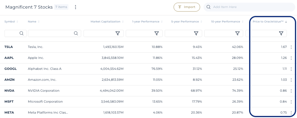 Viewing the Magnificent 7 stocks through the StockOracle™ lens shows that while traditional metrics such as PE and forward PE show that several of these stocks trade at elevated multiples, the Price-to-OracleValue™* comparison reveals that not all premiums are equal.