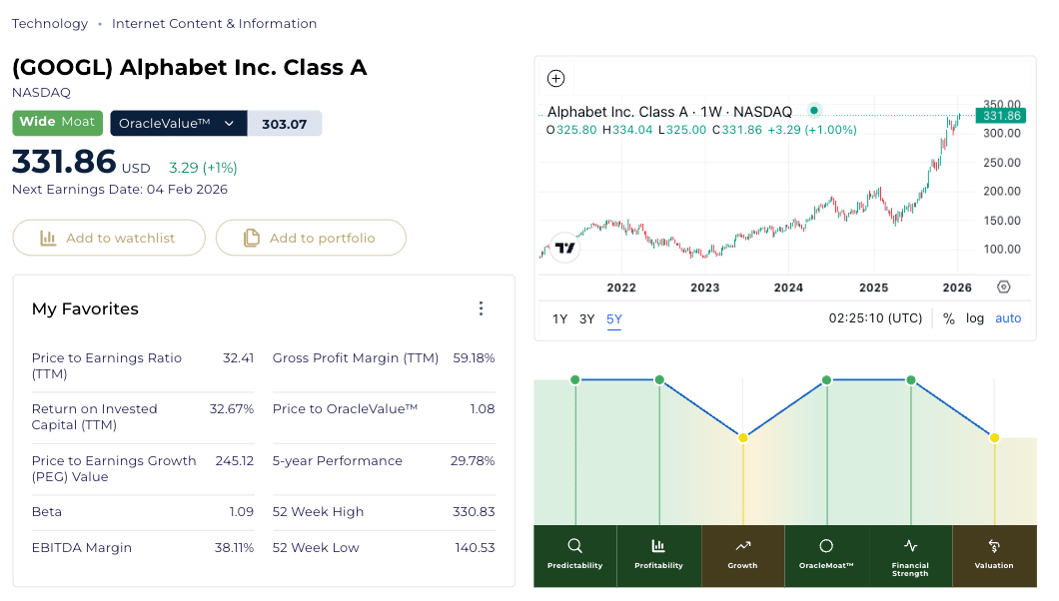 Through StockOracle™ Alphabet’s breakdown, the company shows high Predictability, Profitability, OracleMoat™, and Financial Strength, reflecting stable advertising cash flows, strong margins, and a durable competitive position. Growth registers at a more moderate level, as its core businesses mature, while Valuation sits in the mid-range, suggesting that it is slightly pricier, compared to our proprietary OracleValue™ calculation.