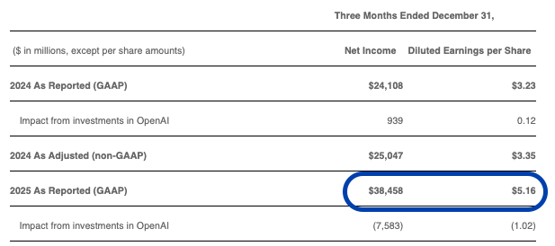 In Microsoft’s press release it was disclosed that OpenAI-related investments lowered GAAP earnings by approximately $7.6 billion in 2025.