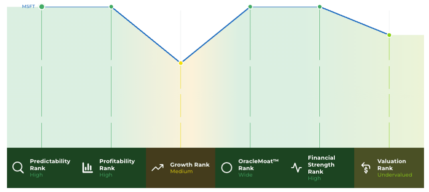 MSFT’s OracleIQ™’s profile reads like a classic hyperscaler in its “grown-up” phase: high predictability, high profitability, wide moat, strong financial strength, and medium growth.