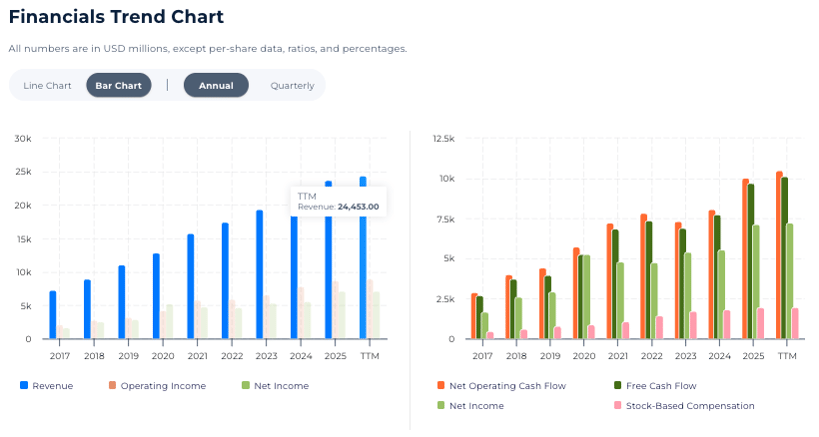 Now fast forward seven years. Revenue has crossed $23.7 billion, more than 2.6 times what it was before. Gross margins have improved from 85% to 88%. Operating income has climbed to $8.7 billion at a 36% margin. By every measurable metric, this is a meaningfully better business than it was seven years ago.