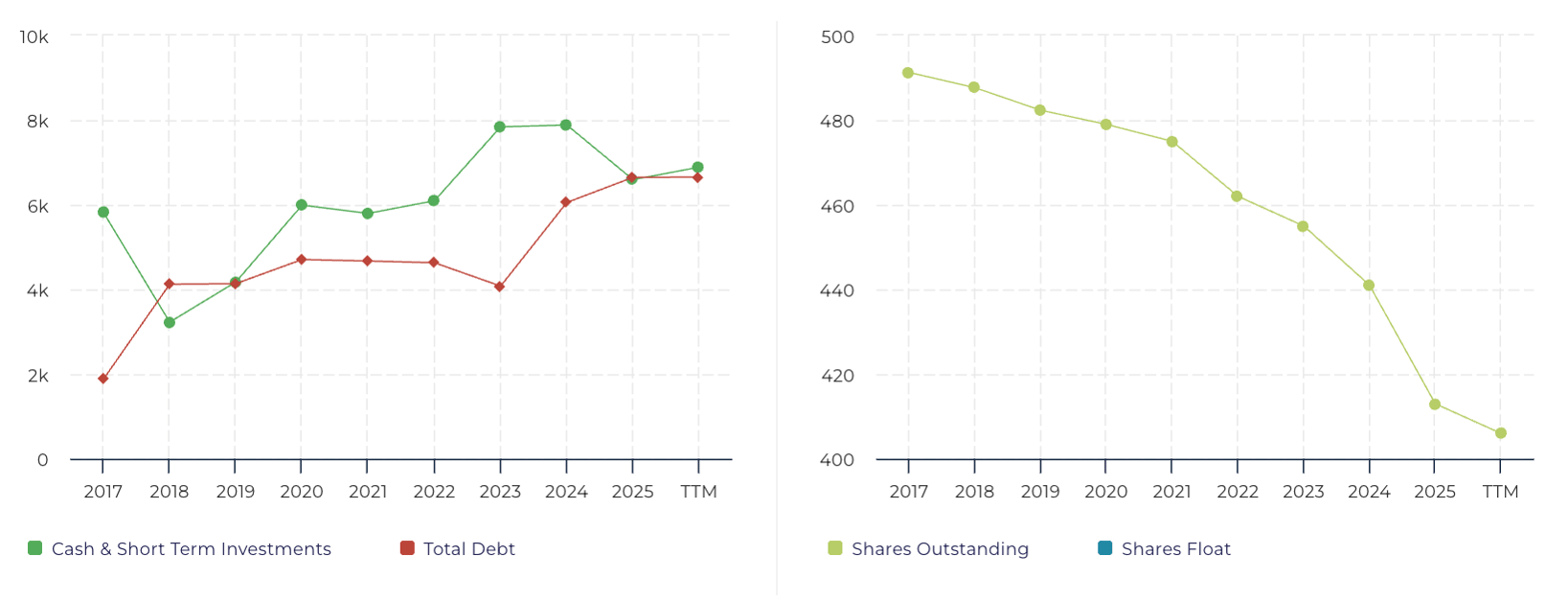 The share count has also been declining steadily over time, from approximately 480 million shares outstanding in 2017 to around 405 million today, a meaningful reduction that has supported per-share earnings growth even during periods of slower headline revenue growth.