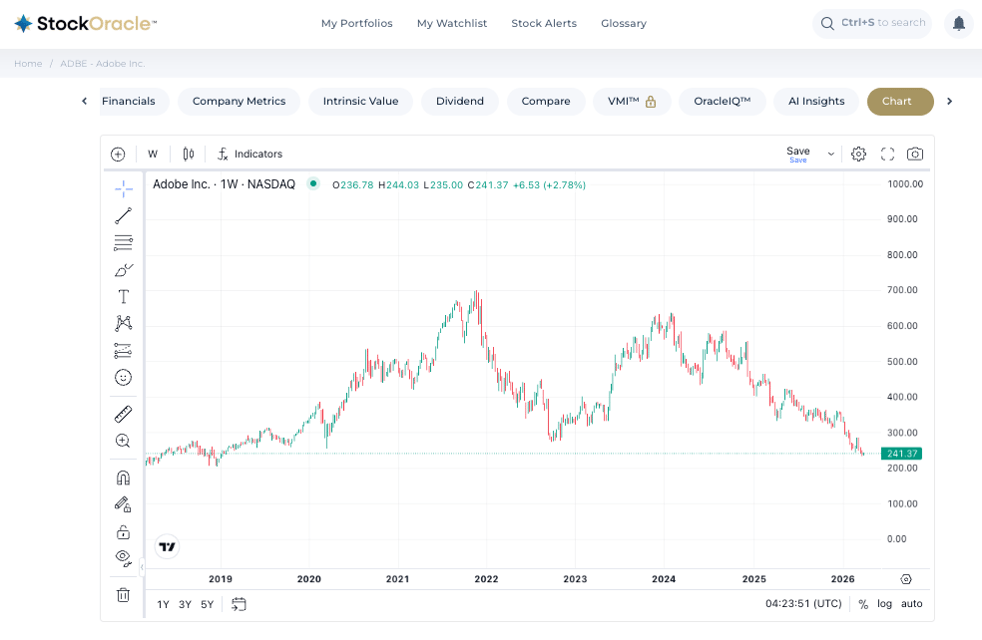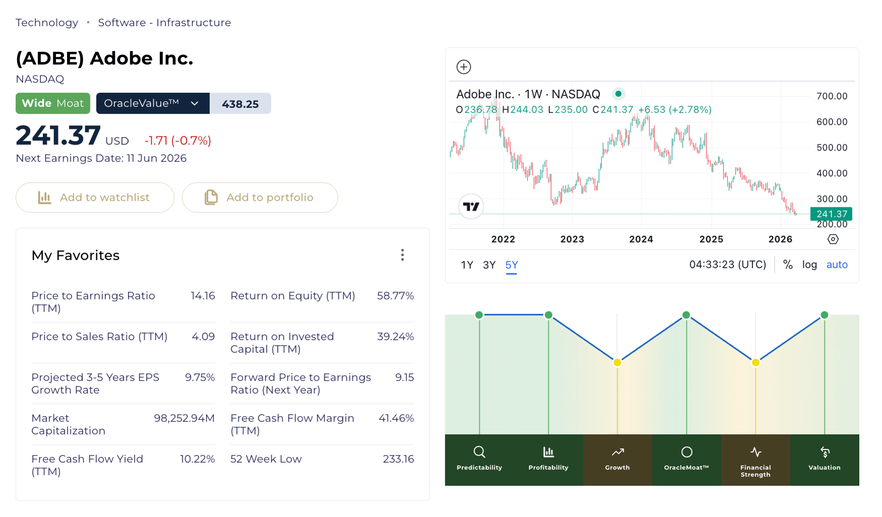 Through StockOracle™ Adobe's breakdown, the company scores highly across Predictability, Profitability, Financial Strength, and OracleMoat™. Growth sits at a moderate level, which reflects both the scale Adobe already operates at and the near-term uncertainty around its AI transition. Valuation is where the picture becomes particularly interesting, and we will get to that shortly.