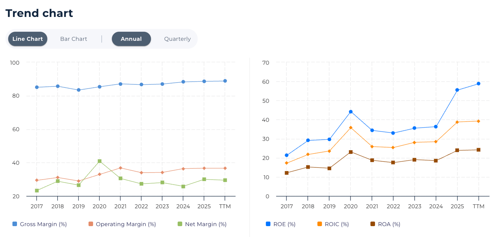 The returns picture reinforces this. Return on Equity (ROE) stands at 58.77%, Return on Invested Capital (ROIC) at 39.24%, and Return on Assets (ROA) at approximately 24%.