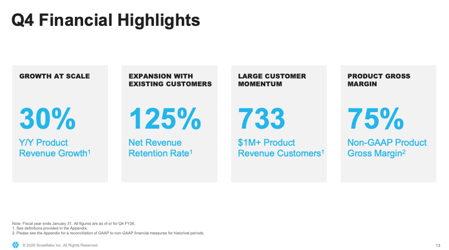 At its peak, Snowflake reported net revenue retention above 150% and 125% in the latest earnings at Q4, meaning every existing customer was spending more year over year without a single new customer being added.