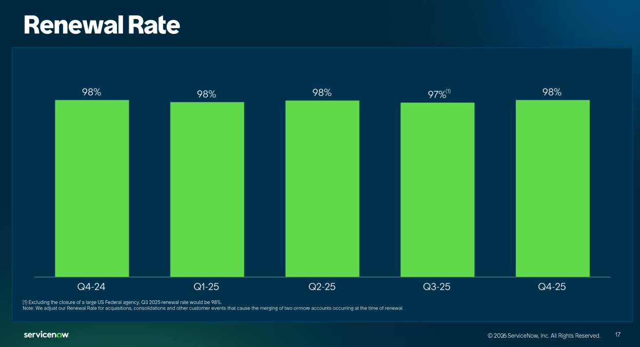 ServiceNow, for example, renews roughly 98% of its customers every single year. That is not customer loyalty. That is closer to a structural dependency.