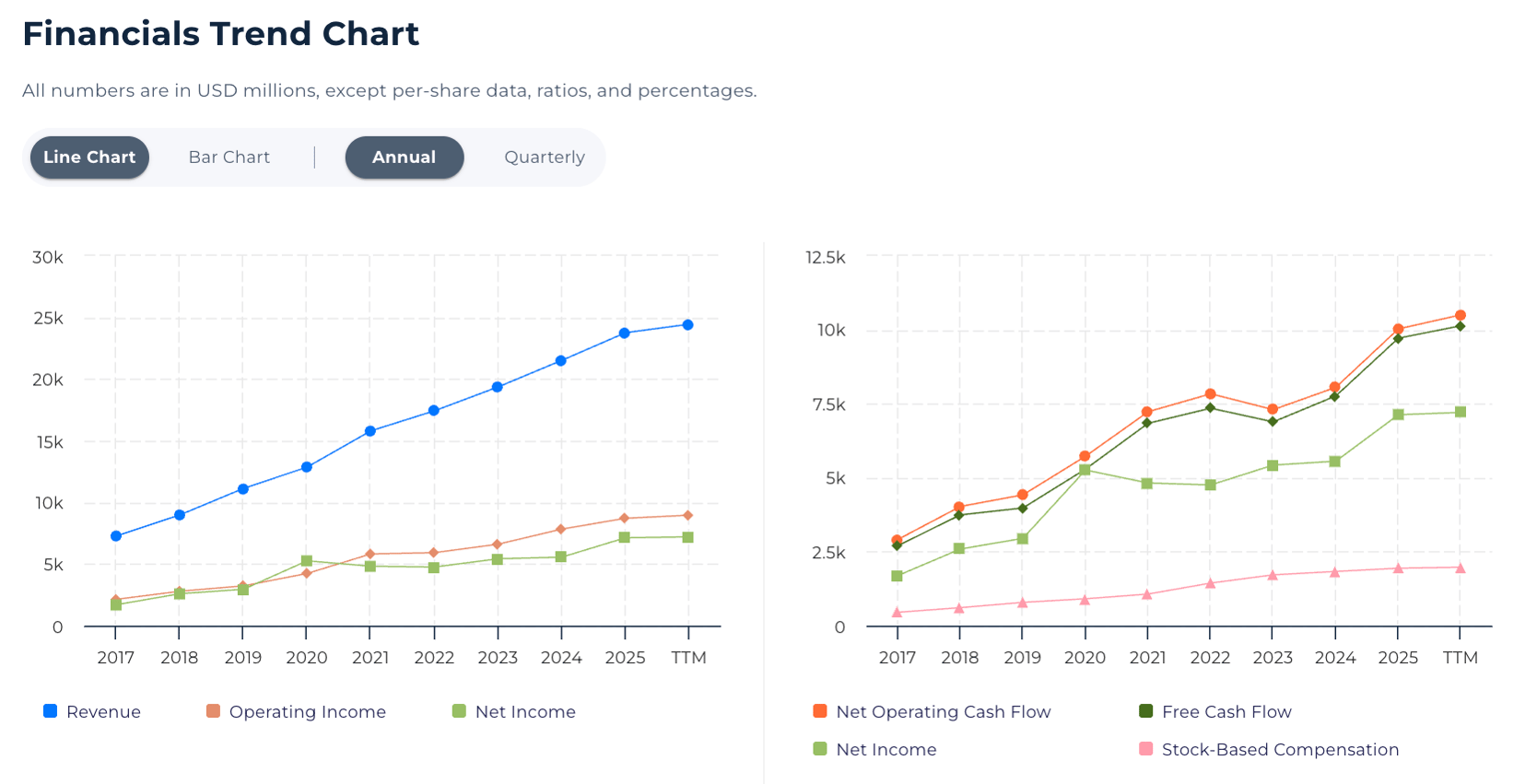 Adobe's Predictability dimension reflects a consistent financial track record in the software industry. Revenue has grown in a near-unbroken upward line from approximately $7 billion in 2017 to over $24 billion today, with no meaningful declines even during periods of broader economic stress. Operating income and free cash flow have tracked revenue higher across the same period, reinforcing the quality and repeatability of the model.