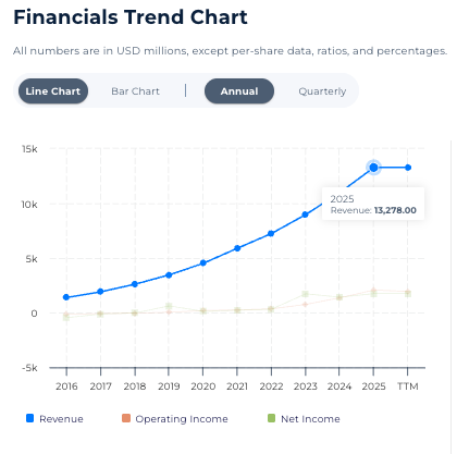 ServiceNow’s revenue trajectory since 2016 has been uninterrupted. What began as approximately $1.5 billion in revenue in 2016 has expanded to $13.27 billion on a trailing twelve-month basis in 2025. That kind of scaling suggests a highly durable demand model.