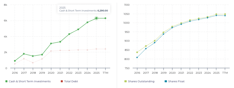However, recent trends show stabilization. From 2024 into 2025, share count growth has begun to flatten. Management has also authorized a $5 billion share repurchase program, including a $2 billion accelerated buyback in Q4 2025 earnings call.