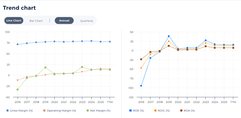 In 2016, operating and net margins were deeply negative. Fast forward to 2025, net margins have turned sustainably positive.