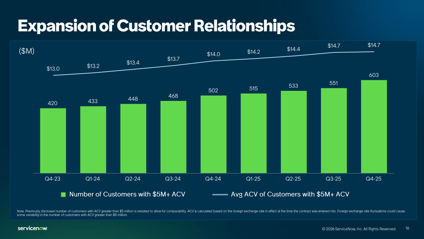 Recent customer metrics reinforce this stickiness. ServiceNow has 603 customers spending over $5 million annually, representing a 20% increase year-over-year.