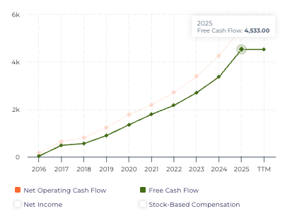 In 2025, ServiceNow generated $5.44 billion in operating cash flow and $4.63 billion in free cash flow. The operating cash flow chart resembles a steady upward slope, reinforcing that profitability improvements are translating into real cash generation.